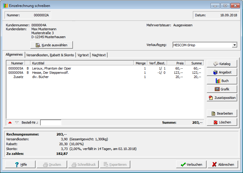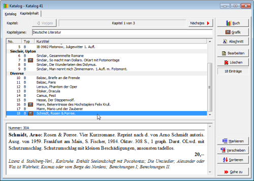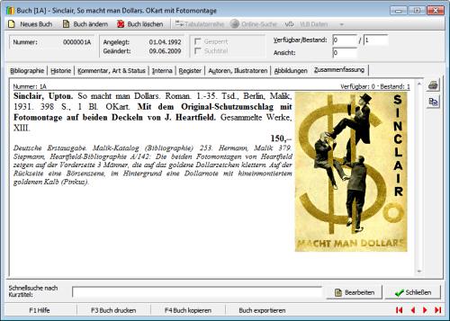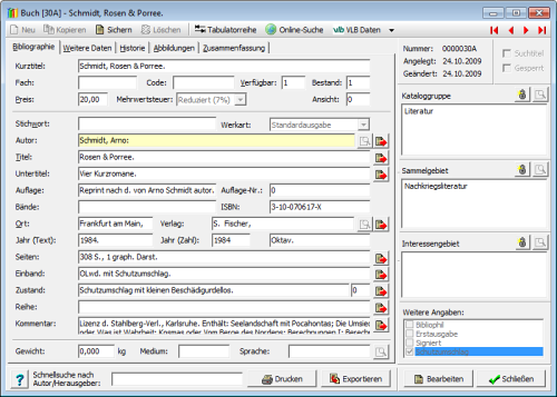 Antiquar-PC ist eine Komplettlösung zur Verwaltung von Buch- und Kunstantiquariaten. Die Software umfasst die Verwaltung von Kunden, Büchern und Grafiken, das Erstellen von Angeboten und Katalogen, sowie ein komplettes Bestell- und Rechnungswesen.